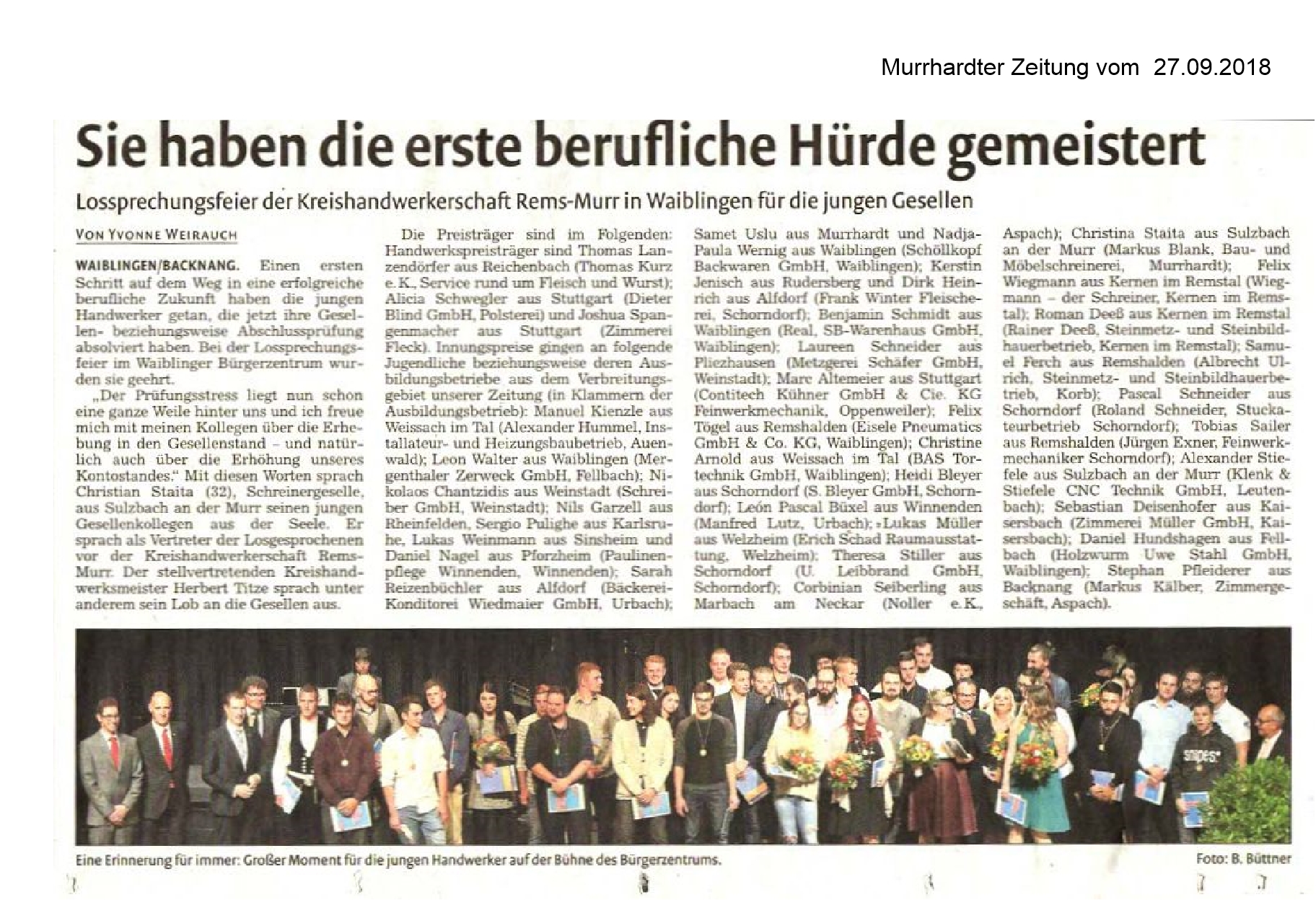 27. September 2018 - Murrhardter Zeitung - Kreishandwerkschaft Rems-Murr - Sie haben die erste berufliche Hürde gemeistert