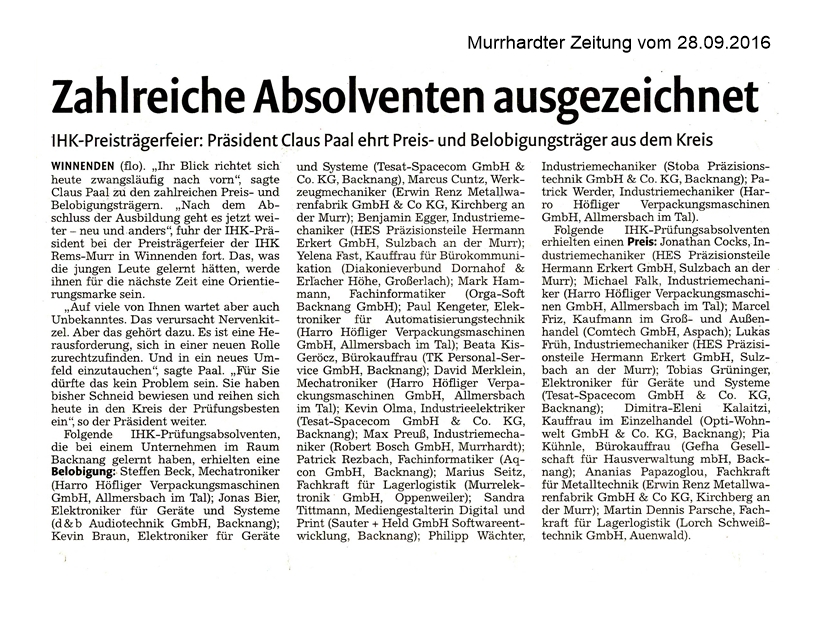 28. September 2016 - Murrhardter Zeitung - Bosch/Murrelektronik - Zahlreiche Absolventen ausgezeichnet