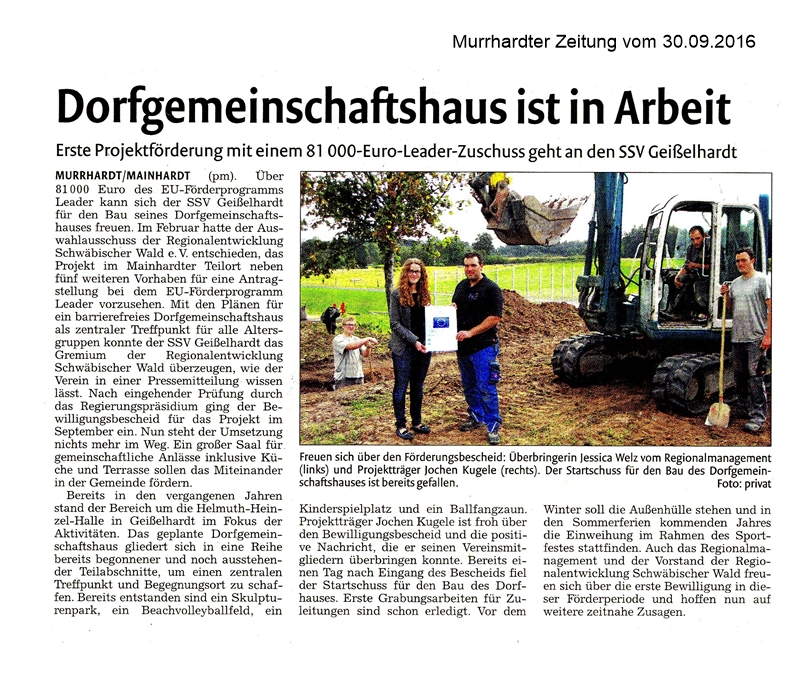 30. Septembr 2016 - Murrhardter Zeitung - Leader - Dorfgemeinschaftshaus ist in Arbeit