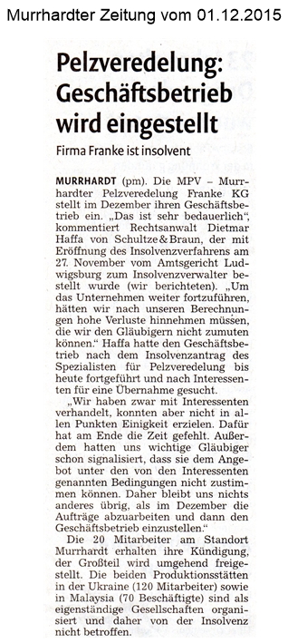 01. Dezember 2015 - Murrhardter Zeitung - MPV - Pelzveredelung: Geschäftsbetrieb wird eingestellt