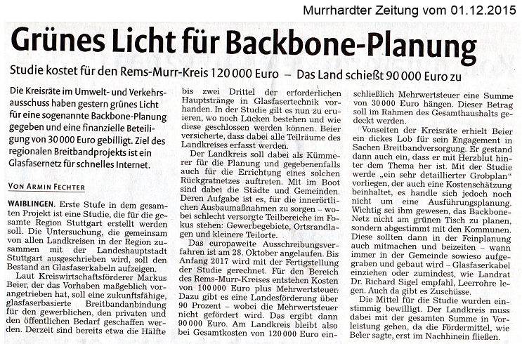 01. Dezember 2015 - Murrhardter Zeitung - WM - Grünes Licht für Backbone-Planung