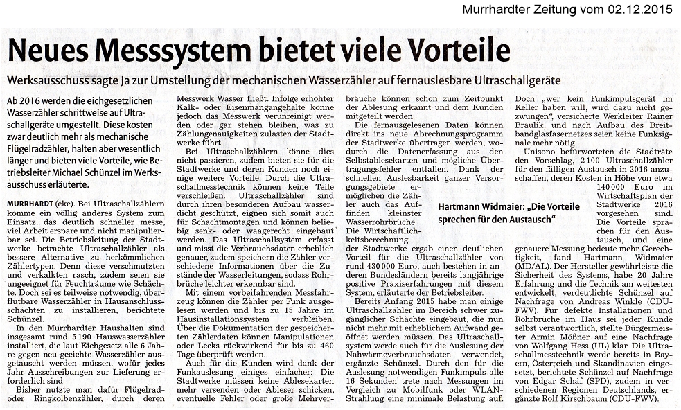 02. Dezember 2015 - Murrhardter Zeitung - Stadtwerke - Neues Messsystem bietet viele Vorteile
