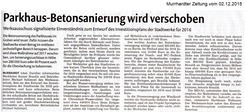 02. Dezember 2015 - Murrhardter Zeitung - Stadtwerke - Parkhaus-Betonsanierung wird verschoben