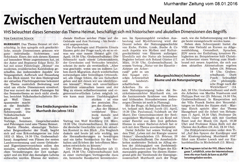 08. Januar 2016 - Murrhardter Zeitung - VHS - Zwischen Vertrautem und Neuland
