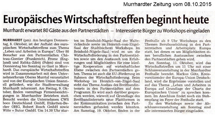 08. Oktober 2015 - Murrhardter Zeitung - UFOM/Murrhardt - Europäisches Wirtschaftstreffen beginnt heute
