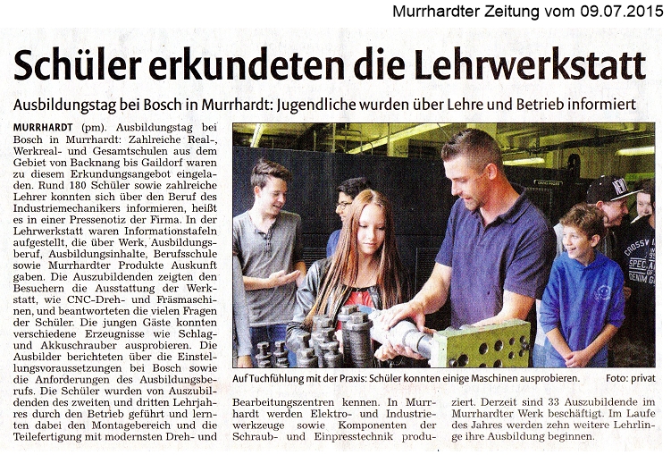 09. Juli 2015 - Murrhardter Zeitung - Schüler erkundeten die Lehrwerkstatt