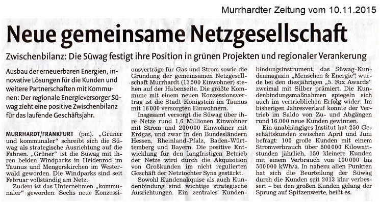10. November 2015 - Murrhardter Zeitung - Süwag - Neue gemeinsame Netzgesellschaft