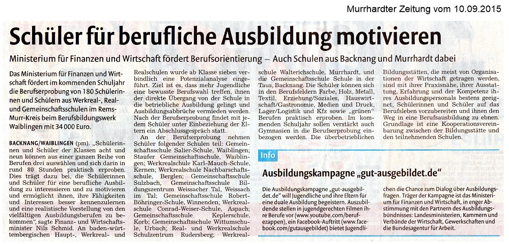 10. September 2015 - Murrhardter Zeitung - Schüler für berufliche Ausbildung motivieren