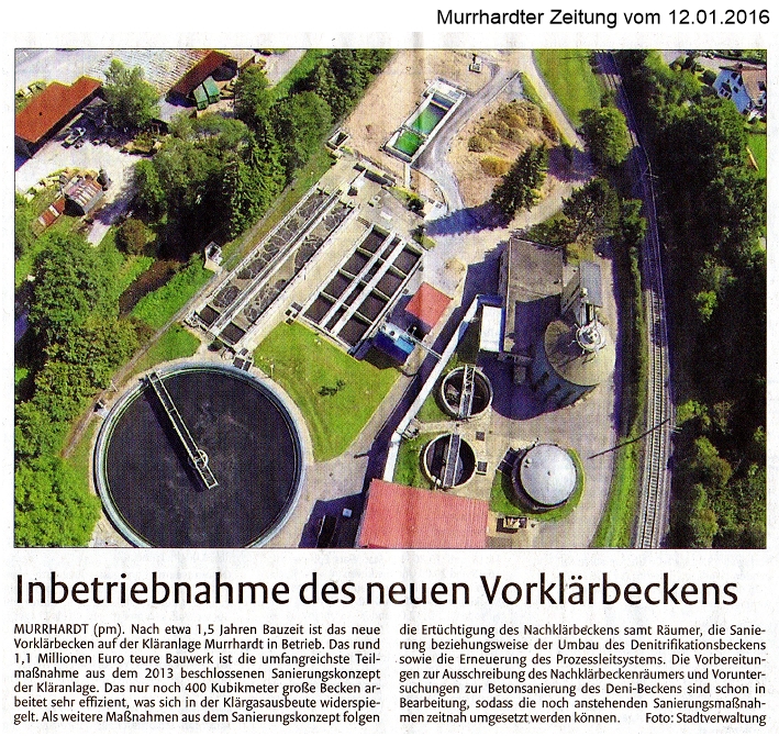 12. Januar 2016 - Murrhardter Zeitung - Riker+Rebmann - Inbetriebnahme des neuen Vorklärbeckens