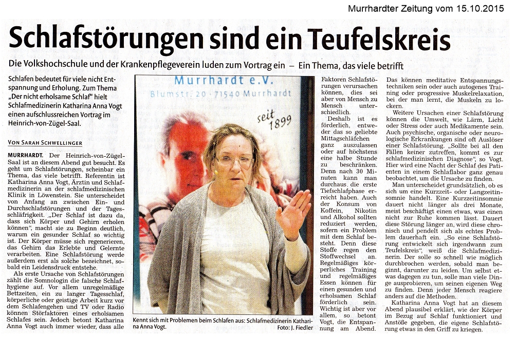15. Oktober 2015 - Murrhardter Zeitung - VHS - Schlafstörungen sind ein Teufelskreis