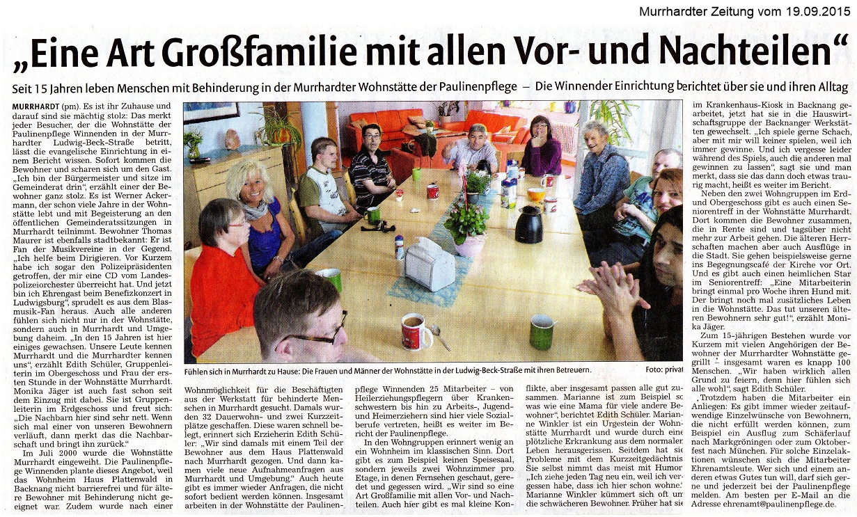19. September 2015 - Murrhardter Zeitung - Paulinenpflege - "Eine Art Großfamilie mit allen Vor - und Nachteilen"