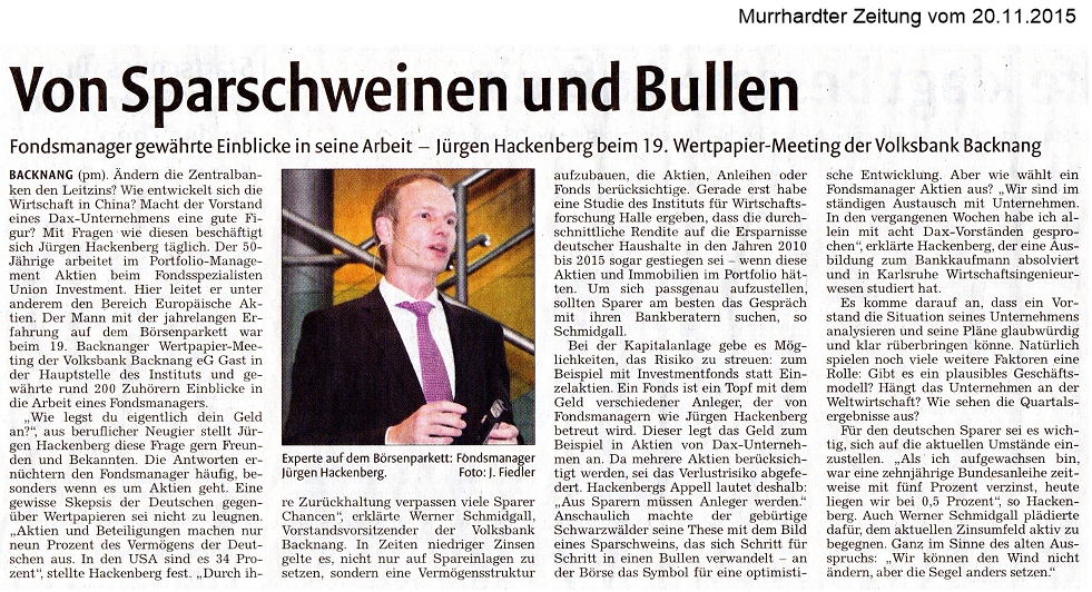 20. November 2015 - Murrhardter Zeitung - Volksbank Backnang - Von Sparschweinen und Bullen