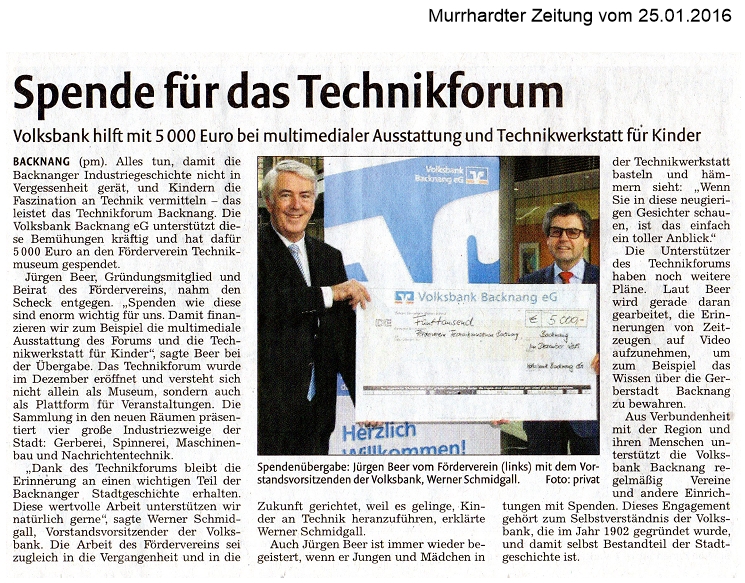 25. Januar 2016 - Murrhardter Zeitung - Volksbank - Spende für das Technikforum