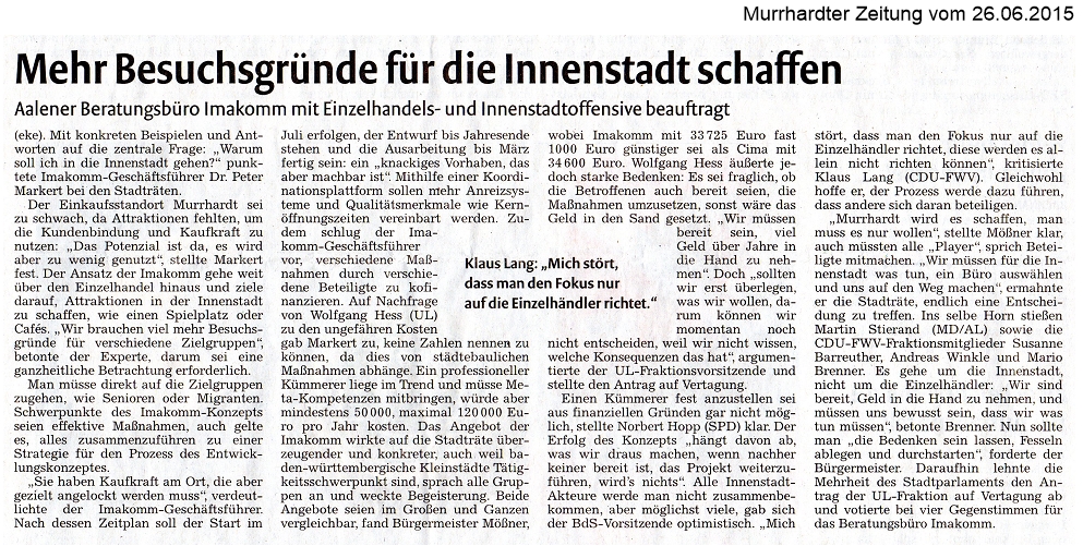 26. Juni 2015 - Murrhardter Zeitung - Mehr Besuchsgründe für die Innenstadt schaffen