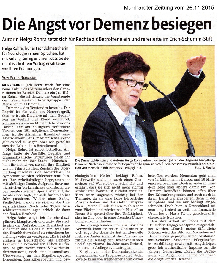 26. November 2015 - Murrhardter Zeitung - Erich Schumm Stiftung - Die Angst vor Demenz besiegen
