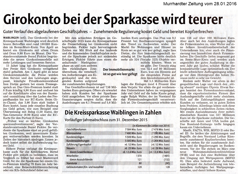 28. Januar 2016 - Murrhardter Zeitung - Kreissparkasse - Girokonto bei der Sparkasse wird teurer