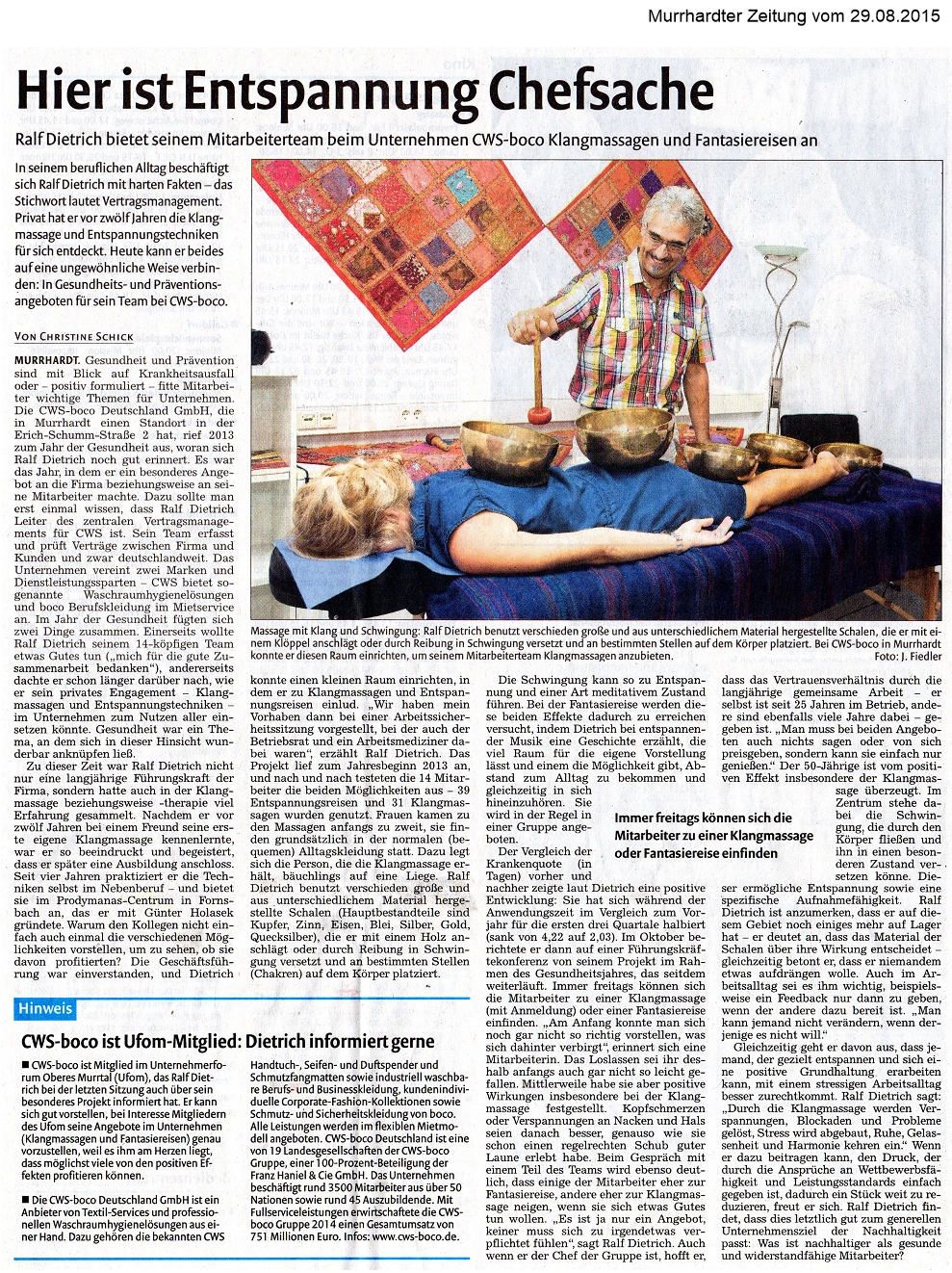 29. August 2015 - Murrhardter Zeitung - CWS-boco - Hier ist Entspannung Chefsache