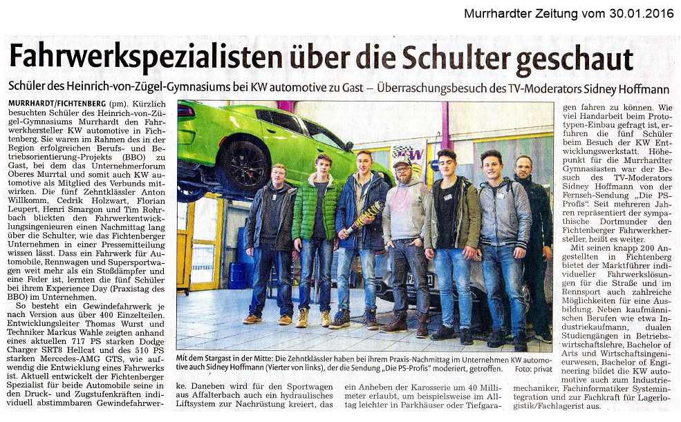 30. Januar 2016 - Murrhardter Zeitung - BBO/KW automotive - Fahrwerkspezialisten über die Schulter geschaut