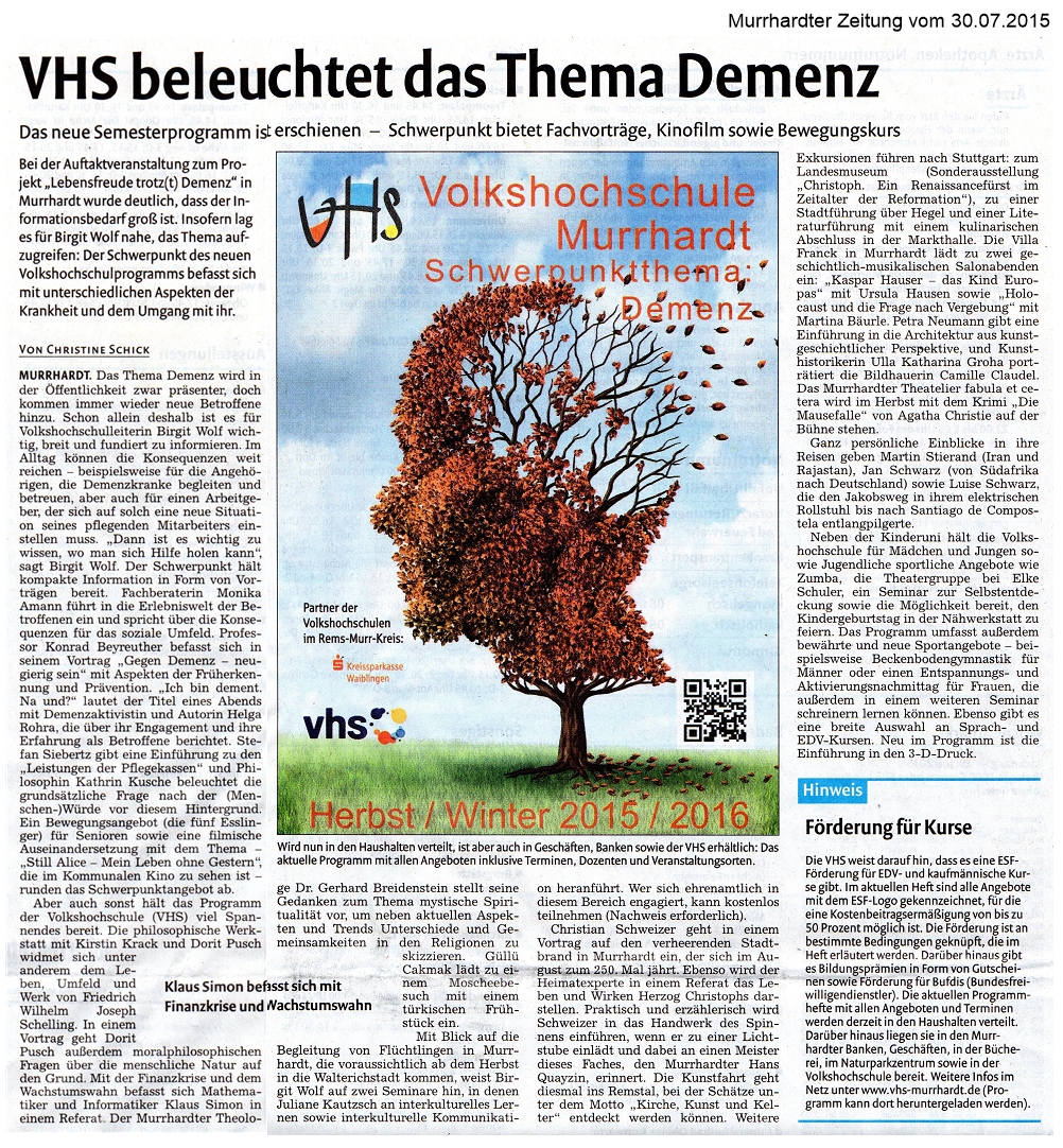 30. Juli 2015 - Murrhardter Zeitung - VHS beleuchtet das Thema Demenz