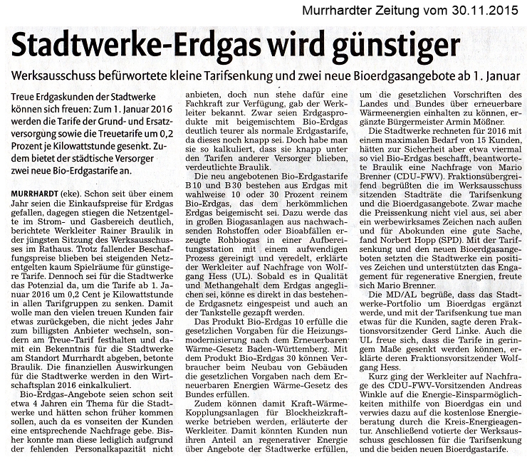 30. November 2015 - Murrhardter Zeitung - Murrhardt/Stadtwerke - Stadtwerke-Erdgas wird günstiger