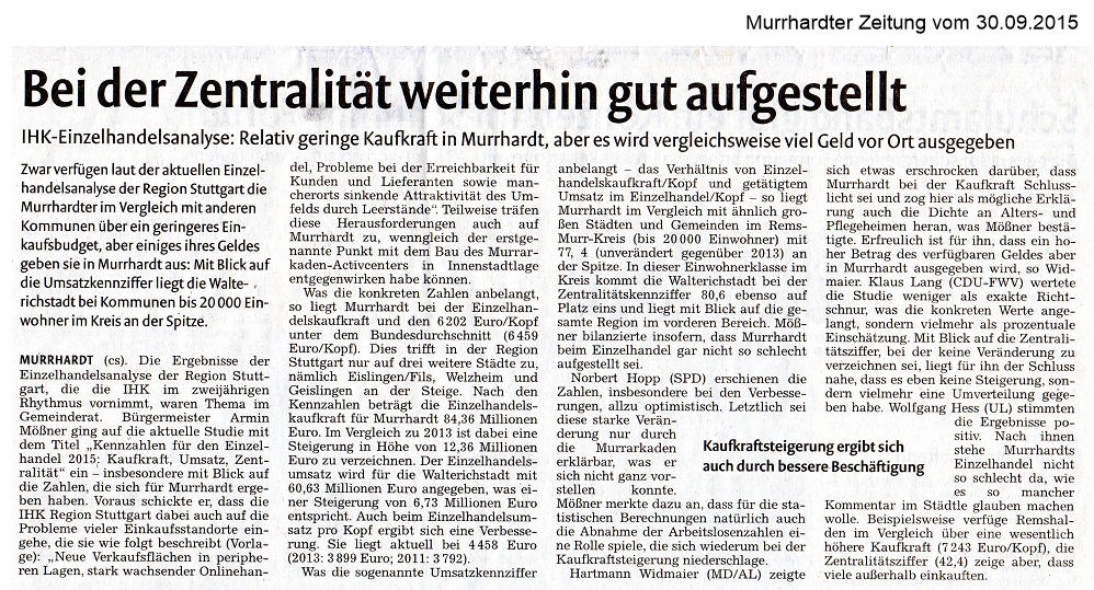 30. September 2015 - Murrhardter Zeitung - IHK/Murrhardt - Bei der Zentralität weiterhin gut aufgestellt