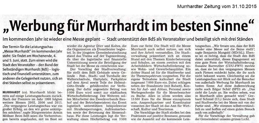 31. Oktober 2015 - Murrhardter Zeitung - Murrhardt/UFOM - "Werbung für Murrhardt im besten Sinne"